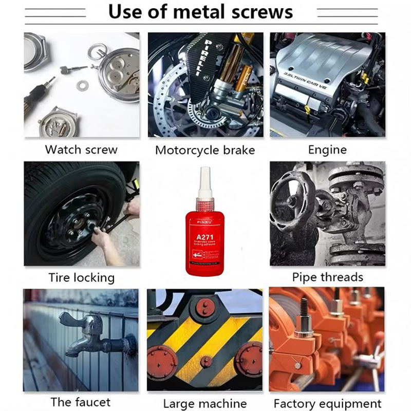 Anaerobic Adhesive A271 is a single-component, anaerobic curing threadlocking adhesive widely used in mechanical assembly, automotive manufacturing, electronic equipment, and other fields. It is used to prevent bolts and nuts from loosening due to vibration or impact, and provides sealing and corrosion protection.